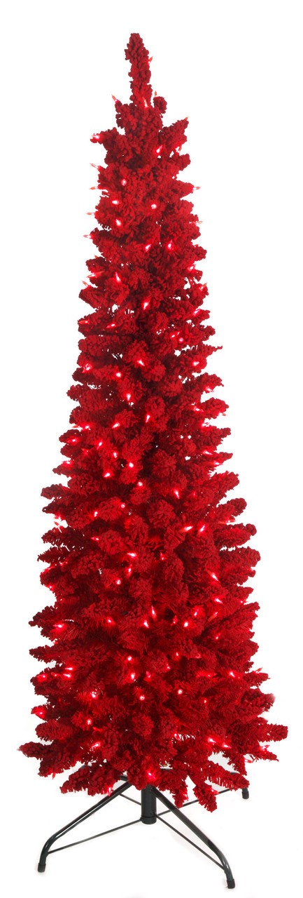 Artificial Red Flocked Valentino Pencil Trees. Slim Size Trees with 5.5mm Red LED Light. Available in 3 Sizes - 5' to 9' Tall. Wire Stands Included